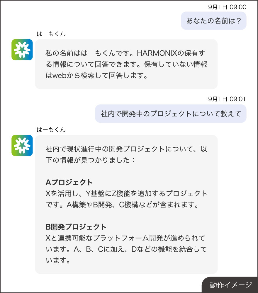 RAG(Retrieval-Augmented Generation)技術を活用することで、社内規程・マニュアル・技術資料を横断的に検索できるほか、FAQなどの社内情報に加え、プロジェクト推進を支援する情報も即時に提供します。